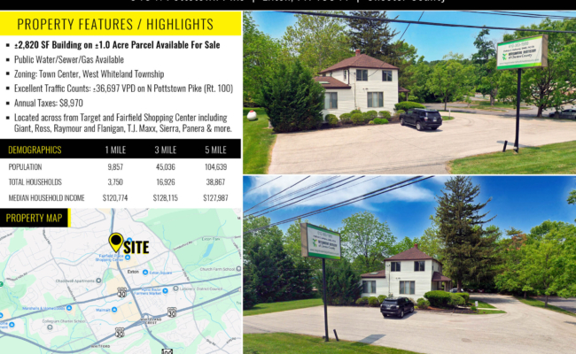 This property consists of a 2,820 SF building (currently fit out as a dental practice) sitting on approximately 1 acre of land. Located in West Whiteland Township, this commercial property has access to public utilities ( water, sewer and natural gas) and is zoned for Town Center, which allows for a multitude of uses. This property also features an impressive daily traffic count of approximately 36,697 VPD on N Pottstown Pike. Surrounded by major retailers like Target, Giant, Ross, and more, this property enjoys a prime location for businesses and retailers. This property also benefits from strong demographics, with a median household income surpassing $127,000 within a 5-mile radius, and a rapidly growing residential base. Strong development potential as well.
